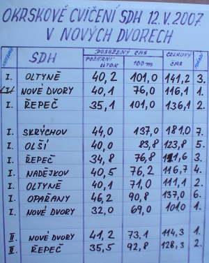 V sobotu 12.5. 2007 se v Nových Dvorech konalo okrskové klání v požárním útoku a ve štafetách