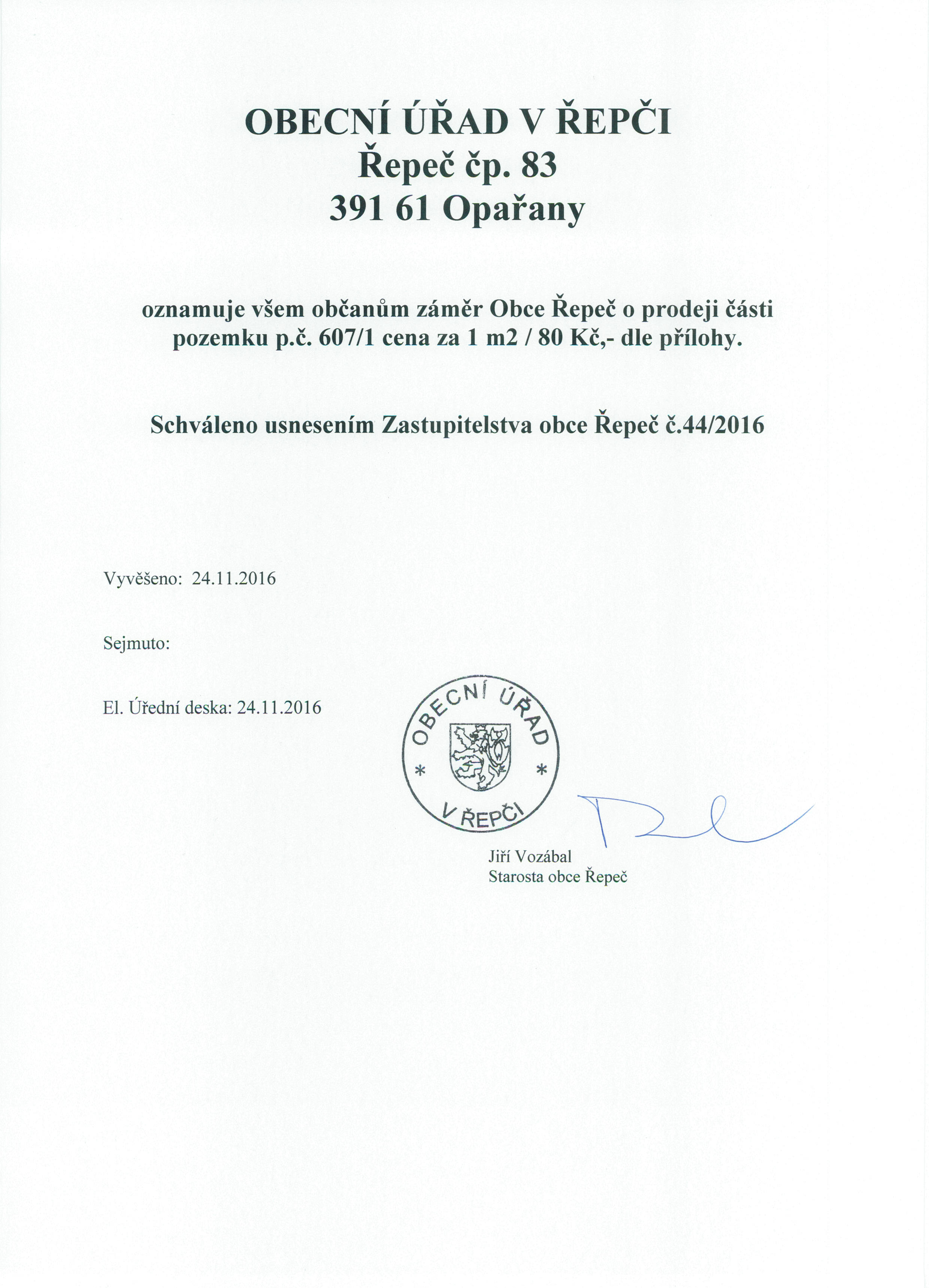 Oznámení záměru prodeje pozemku pč.607/1
