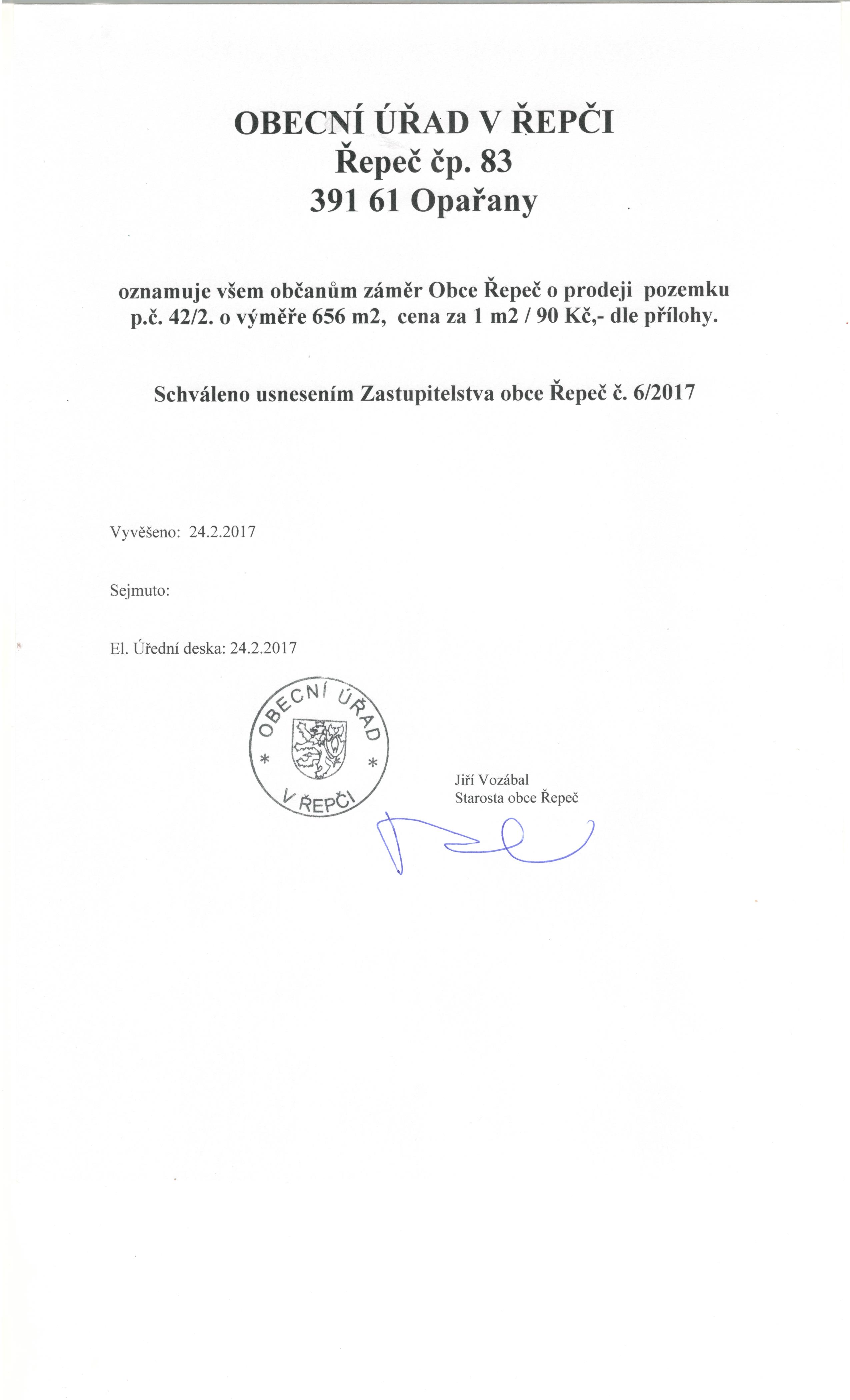 Oznámení záměre prodeje pozemku p.č.42/2.